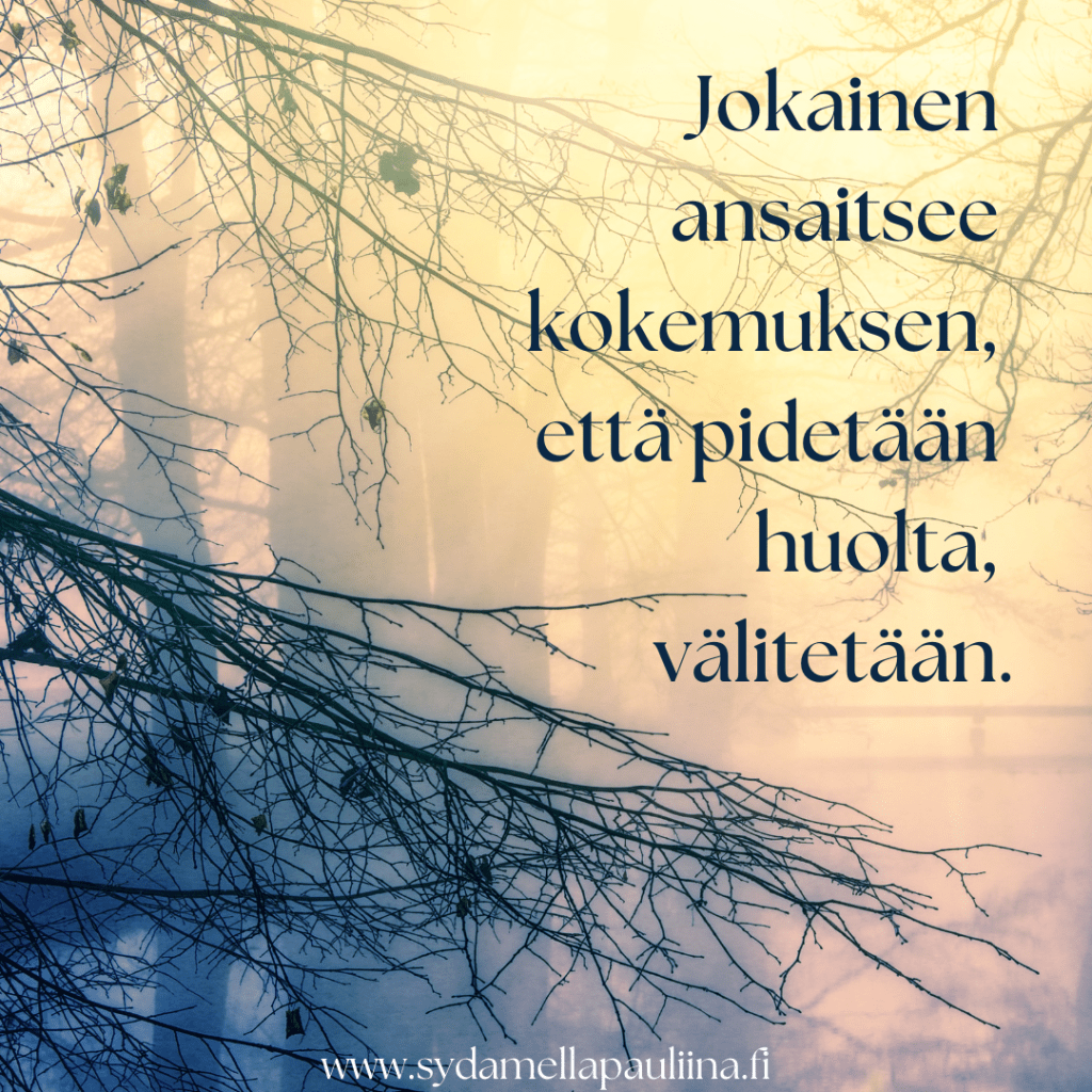 Sinä kiltti, empaattinen, toisten tarpeille herkkä ihminen. Milloin olet viimeksi saanut itse tarpeeksi huomiota, hoivaa, tukea, apua, välittämistä tai mukavia tekoja? Milloin olet herkästi kuunnellut omia tarpeitasi ja toiveitasi toisten tarpeiden sijaan? Entä oletko uskaltanut ja osannut sanoittaa niitä ääneen ihmisille, joiden kanssa elät?
