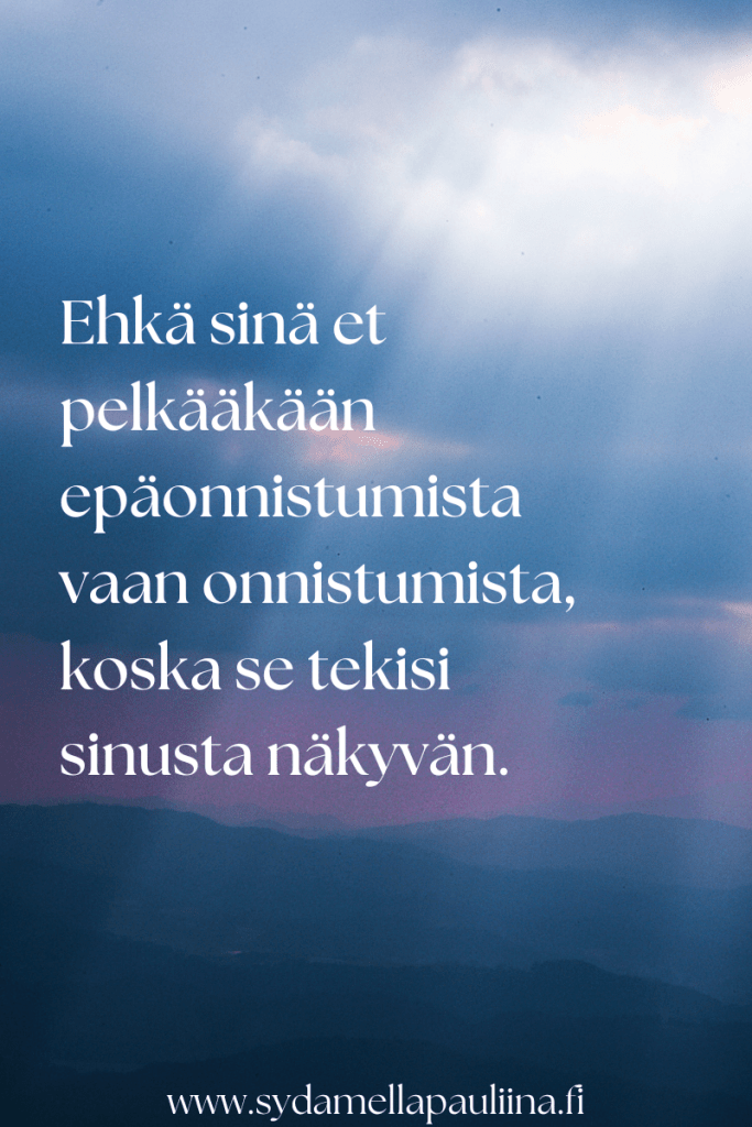 Eniten saatamme kuitenkin pelätä onnistumista, niin nurinkuriselta kuin se kuulostaakin. Entä jos onnistunkin upeasti, menestyn, saan unelmieni puolison, rakkauden, rahallisen runsauden, merkityksellisen työn, kodin, ja kaikki villeimmätkin unelmani käyvät oikeasti toteen? Entä jos niin käy ihan oikeasti? Osaanko olla onnellinen? Osaanko elää sellaista elämää? Oletko koskaan miettinyt, mitä se tarkoittaisi käytännössä? Aika moni asia menisi uusiksi.