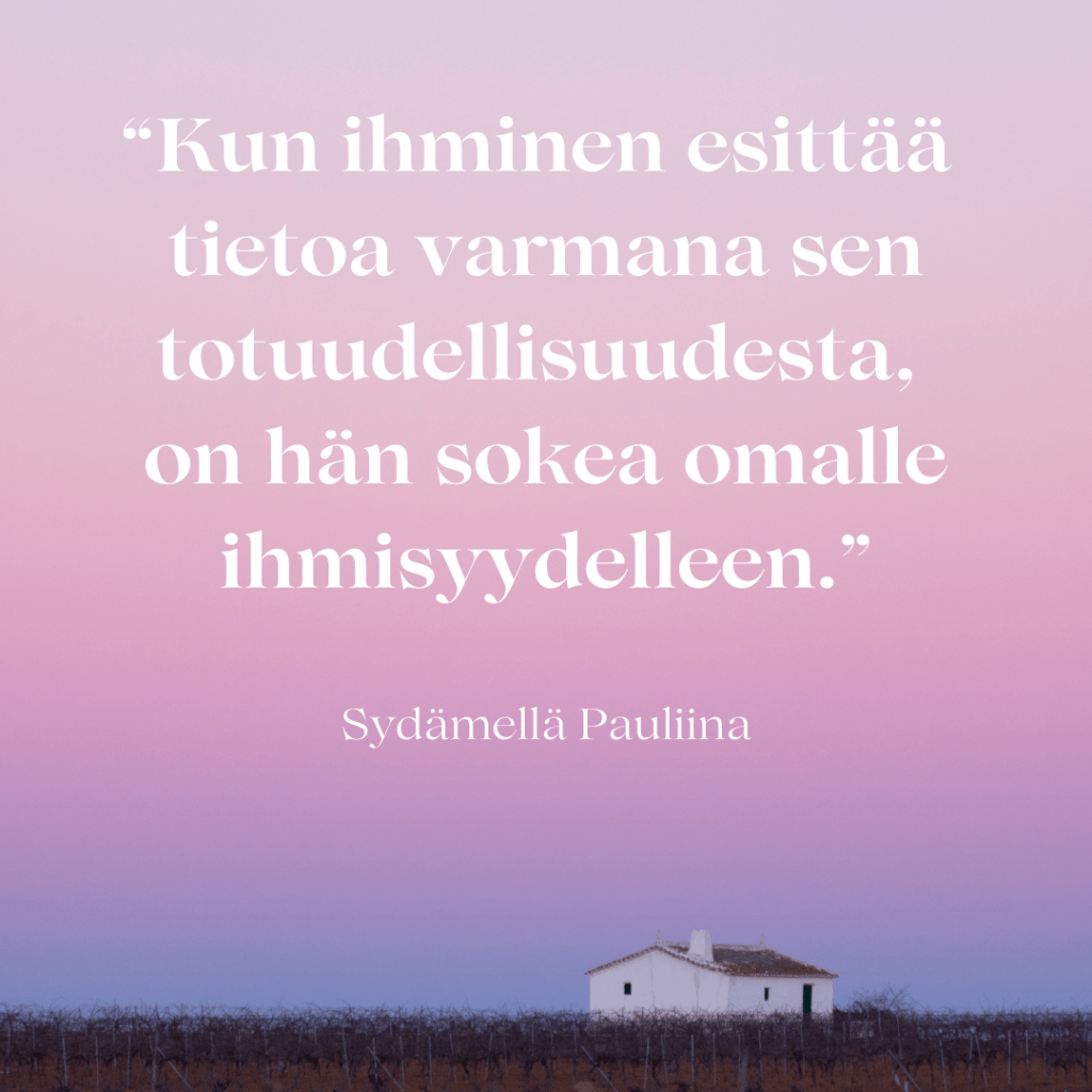 On upeaa, että ihmiset puhuvat omaa totuutta, ja tähän todellakin kannustan sinuakin! Mutta jokaisen yksilön omalla vastuulla on myös valita, mitä ja ketä uskoo. Viisas ymmärtää, että oma totuus on itselle totta tässä ja nyt eikä se ole koko totuus aina ja kaikille, tai kaikesta.